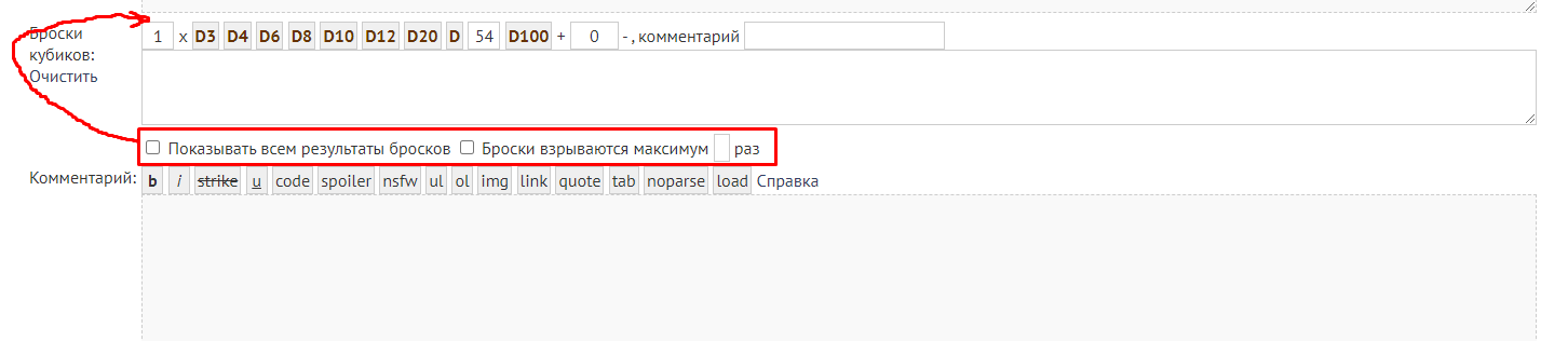 Тогда всё будет в одном месте, визуально относиться к одному полю, меньше вероятности забыть о таких настройках. А то я бросаю кубы, а затем частенько проглядываю мимо этих настроек и приходится редактировать пост и ставить всё-таки галочку показа результатов. Ну а галочки про взрывы бросков нужно ставить перед тем, как делать броски, поэтому они тоже логично должны быть перед кнопками бросков.