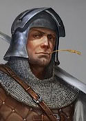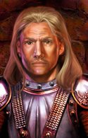 Молодой человек лет двадцати, среднего роста и крупного телосложения и светлой кожей. Имеет стоические черты лица, серые глаза и длинные, вьющиеся волосы светлого оттенка. Закован с головы до пят в фамильные доспехи и носит двуручный меч. На поясе закреплена священная книга, с символом церкви Торма. За спиной кожаный рюкзак с закрепленным на нём реликварием. В полном доспехе: Без шлема: