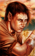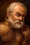 Молодой мужчина, а скорее даже юноша крепкого сложения, чья выправка выдает в нём человека, привыкшего к тяжести доспехов и воинской дисциплине. Лицо с правильными, почти строгими чертами: волевой подбородок, каштановые волосы средней длины и короткая, аккуратно подстриженная борода выдают аристократическое происхождение. Прямой взгляд карих глаз кажется внимательным, но при этом доброжелательным. Однако, эта доброжелательность может показаться стороннему наблюдателю обманчивой и опасной, стоит его взгляду зацепиться за святой символ Тира – медальон, изображающий весы, стоящие на боевом молоте – который всегда находится на виду поверх одежды или доспехов и не оставляет сомнений в роде деятельности его обладателя.