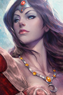 Прекрасная крохотная фэя-защитница своего народа. У нее светлые, короткие волосы, собранные в два пучка по бокам головы, и заостренные уши. За головой видны два крыла, похожие на крылья бабочки. Одета она в фиолетовое платье с коричневым корсетом, украшенным золотыми элементами. На плечах у нее броня, и на руках коричневые наручи. На ногах у нее фиолетовые высокие носки с узорами и коричневые сапоги. С бёдер свисают золотые цепочки.
