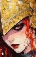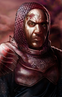 Этот устрашающего вида полуорк носит цвета варварского племени Утгардта. В его взгляде читается честь и достоинство, отличающие его от типичных представителей его вида.