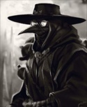 Незнакомец облачён в просторный тёмный плащ, опадающий по сторонам на манер сложенных крыльев. Под плащом виднеется старательно застегнутый на все пуговицы чёрный дублет, что перетянут поясом с множеством навесных карманов и сумок. Из некоторых карманов выглядывают стеклянные пробирки и колбы, другие застегнуты и надежно скрывают содержимое от глаз посторонних. Ладони незнакомца обтягивает чёрная кожа перчаток, тонкие пальцы левой руки покоятся на выполненном в форме головы ворона набалдашнике трости. Пальцы правой ощупывают пристегнутую к лацкану плаща Эмбер инсигнию. Лицо незнакомца скрывает тёмная маска с выступающим вперед железным клювом и выпуклыми антрацитовыми линзами глаз. Образ довершает широкополая шляпа того же чёрного цвета.
