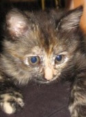 Едва держащийся на лапках комочек шерсти. Странного окраса ("помоечного"), но очень милая. А еще совершенно без чувства самосохранения, и весьма любопытна. Глаза по пять рублей не потому, что страшно, а потому, что интересно. Хотя чаще всего бывает "страшно интересно".