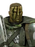 На левой стороне лица у него глубокий рубец, проходящий от виска до подбородка - след от схватки с тиранидским лектором, когда его шлем был пробит когтями чужака. Правая рука обожжена до самого плеча, после того как он собственноручно вынес брата из горящего транспортного модуля во время высадки на Виридий III.