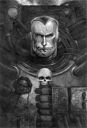 На груди вытатуирован знак ордена Саламандр — пылающий дракон. Его броня расписана огненными узорами, а наплечник украшают клейма битв. Один из наплечников, с недавних пор, Стража Смерти - череп в серебряной оправе.