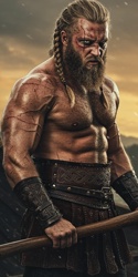 Размер: средний (M) Скорость: 30' (6 ☐)Высокий, широкоплечий, хмурый мужик с большим топором на плече и ярко выраженной мускулатурой. Говорит мало, и зачастую его хриплый, напоминающий рык, голос не сообщает собеседнику ничего хорошего. В бою же, напротив, ведёт себя шумно и агрессивно, порой распугивая врагов одним лишь криком. Носит простую рубаху и шаровары, перехваченные широким кожаным поясом. На голове - видавшая виды куфия, которую северный варвар просто складывает по диагонали и завязывает на затылке. На самом деле Торстейн не такой уж злобный дикарь, как может показаться на первый взгляд, но очень уж хорош этот образ для бизнеса. — Крупный хмурый северянин - сам по себе диковинка. Торстейн и его топор в равной степени примечательны в любом караван-сарае. — Крайне неразговорчив с незнакомцами. При первой встрече Торстейна частенько принимают за немого, чем он вполне доволен. — Татуировки на лице не добавляют привлекательности, но неплохо дополняют образ грозного дикаря. — После всех мучительных попыток местного населения выговорить "Торстейн Рагнарсон" смирился и отзывается даже на "ибн Рагнар". ОБЩЕДОСТУПНАЯ ИНФОРМАЦИЯНаёмный телохранитель при состоятельном путешественнике, грозный северянин с огромным топором, одним своим видом способный сберечь и жизнь, и кошелёк своего патрона в тёмных переулках Багдада. Во всяком случае, так это выглядит на первый взгляд. Те же, кто понаблюдают немного за этой парочкой, без труда обнаружат, что, во-первых, крайне обаятельный шейх Саид ибн Фарух эль-Табриси и сам не так уж беззащитен, а, во-вторых, эти двое куда больше похожи на старых друзей, чем на нанимателя и наёмника. Первое знакомство с северянином обычно состоит лишь из называния имён, и зачастую это Саид представляет молчаливого Торстейна новым знакомым. Но постепенно лёд тает, и с момента, когда собеседник выясняет, что северный дикарь неплохо говорит по-персидски, посредничество харизматичного шейха в диалоге не требуется. А уж Саида-то, кажется, знают все и везде. Душа компании, настоящий кладезь невероятных историй, он, кажется, имеет друзей повсюду от Дамаска до Самарканда, а если и не имеет, то моментально заводит. В караване Торстейн обычно держится неподалёку от своего товарища и не докучает прочим путникам разговорами. Впрочем, сам он не прогонит подошедшего, не откажет хамкарвани в помощи, если таковая потребуется и даже способен поддержать дружескую беседу, покуда она доброжелательна и уважительна. Северянин повидал немало удивительных мест и зарубил немало разных врагов, о чём он расскажет с тем большим удовольствием, чем полнее будет его чаша. *** За время пути Торстейн свыкся с разношёрстной компанией их спутников и даже потрудился запомнить большинство имён. На стоянках он помогал там, где нужны его навыки кузнеца, да стоял в дозорах. В стычках показал себя безжалостным рубакой, без колебаний бросающимся в гущу врагов и оставляя за собой лишь кровавую просеку. Хамкарвани смогли во всей красе увидеть звериную ярость норманов, легенды о которой ещё не успела забыть Европа. Впрочем, вне боя северянин оставался на удивление спокойным и молчаливым. Саид же без устали рассказывал невероятные истории из их совместных странствий от Константинополя до Кашгара и от цветущей некогда Бухары до Багдада. Поведал он и о том, чт