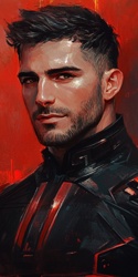 Рост: 182 см / Вес: 85 кг Возраст: 43 года Черты лица немного резкие и угловатые. Скулы высокие, подбородок с небольшим шрамом. У висков и в уголках глаз первые морщины, словно трещины на высохшей глине. Глаза цвета темного янтаря. Кажутся холодными, расчётливыми, но с искоркой авантюризма. Зрачки слегка сужены. Волосы когда-то угольно-чёрные, теперь — пепельно-седые, особенно у висков. Стрижка: «Ёжик» с выбритыми висками (армейский стиль, но уже слегка заросший). Над левым ухом — небольшой шрам (от осколка во время стычки на орбитальной станции). Телосложение атлетическое, но без перекаченности — скорее гибкая сила, как у саблезубого хищника. Пальцы длинные, костяшки покрыты шрамами. На правой руке — татуировка-глиф (символ подразделения из прошлого). Осанка прямая, с налётом усталости. Кожа смуглая, покрытая сетью мелких шрамов и ожогов. Голос хрипловатый, с акцентом Дальних Колоний. Пахнет табачным дымом, мокрым металлом и оружейной смазкой. Постоянно держит правую ладонь на кобуре пистолета, а в пальцах левой сигарету. Если не курит, то просто крутит её в пальцах. Предпочитает скафандр, но если вынужден обходиться без него, то облачается в серо-черный камуфляж с накладками лёгкой брони на грудь, локти и колени.