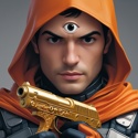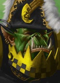 Жуткий орк в солнечно-позолоченном доспехе, ‘украшенном’ шипами и жубами, размером никак не менее космодесантника. Одну руку заменяет трещащая искрами силовая клешня, в другой зажат громыхающий пистолет. На поясе висит вычурный, но вполне орочий топор в паре с украшенной мордой сдвига тяжёлой пулялой. Двигается слишком ловко и быстро для обвешанного стольким металлоломом воина. На голове укреплена щегольская шляпа адмирала с значком Плохих Лун.