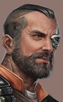 Среднего роста, поджарый брюнет с щедрой долей соли в бороде. Заросшие виски скрыли татуировки на скальпе, но не шею и руки, которые покрыты плотным узором чернил. Серые глаза, точнее, один. Второй - биомеханический имплант старой модели. Много курит.