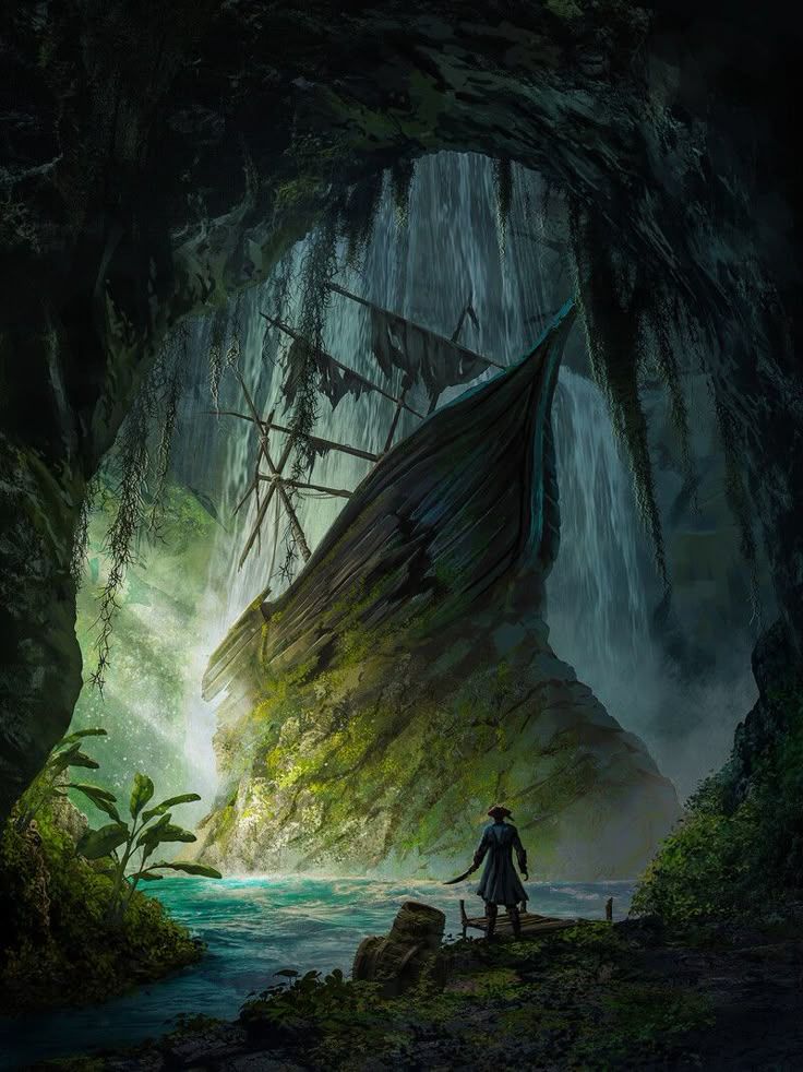 На месте оказалось, что никакая это не тропа, а просто русло ручья, вытекавшего из леса. Оголенные течением камни белели на фоне грязно-желтого песка. Да какая разница, тропа, не тропа – бутылка, мушкет и добрая компания, что может быть лучше для прогулки по джунглям! Подойдя ближе, пираты вдруг осознали, что стена леса перед ними подозрительно безмолвна. Ну и славно, вопли бесстыжих попугаев достали так, что даже взвизги капитана казались лучшей альтернативой. Темно-зеленый занавес сомкнулся за спинами моряков и вскоре под ногами захлюпала жижа – ручей не пересох окончательно, его просто не хватило, чтобы на палящем солнце добраться до моря. Вытекал он из-под скалы, чья темная, мокрая, покрытая мхом туша резко выступила из зарослей. Пройдя вдоль стены, пираты обнаружили расщелину и, шлепая по мокрому полу, вошли внутрь. Пещера, точнее узкий разлом, была тиха и сумрачна. Где-то там, наверху, стены не сходились до конца, оставляя щель, через которую просачивался свет. Притормозив, падре осмотрелся и поёжился – сырость, тусклый свет сверху и гулкая тишина напомнили монастырские стены. Величие Господне здесь, впрочем, давило без какой-либо людской помощи. Разлом повернул на юг, потом на восток – к морю. Томас припомнил, что как раз в этом месте берег представлял собой поросшую кустарником скалу, что и не дало им тут высадиться. Туннель вильнул и вдруг открылся в широкий затопленный грот. В центре его на скале, как на постаменте, возвышались останки корабля. И мистер Клоф сразу подметил – не испанского. С остатков рей свисали замшелые паруса, борт лопнул, зияя черным провалом, в нос ударил запах плесени и холод. Как из подвала.