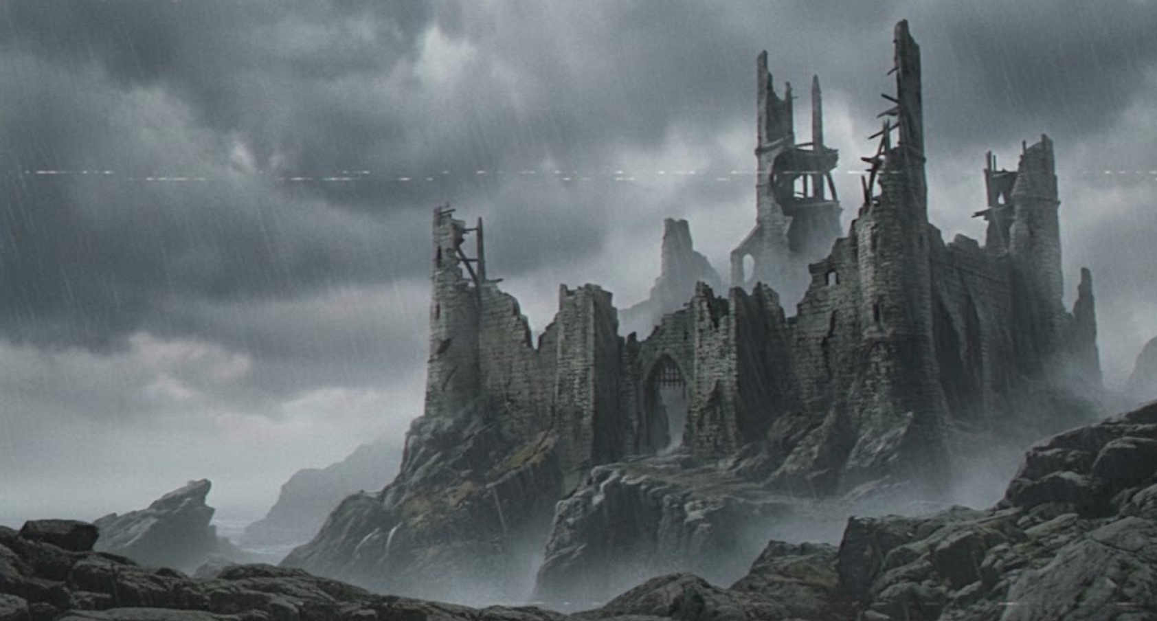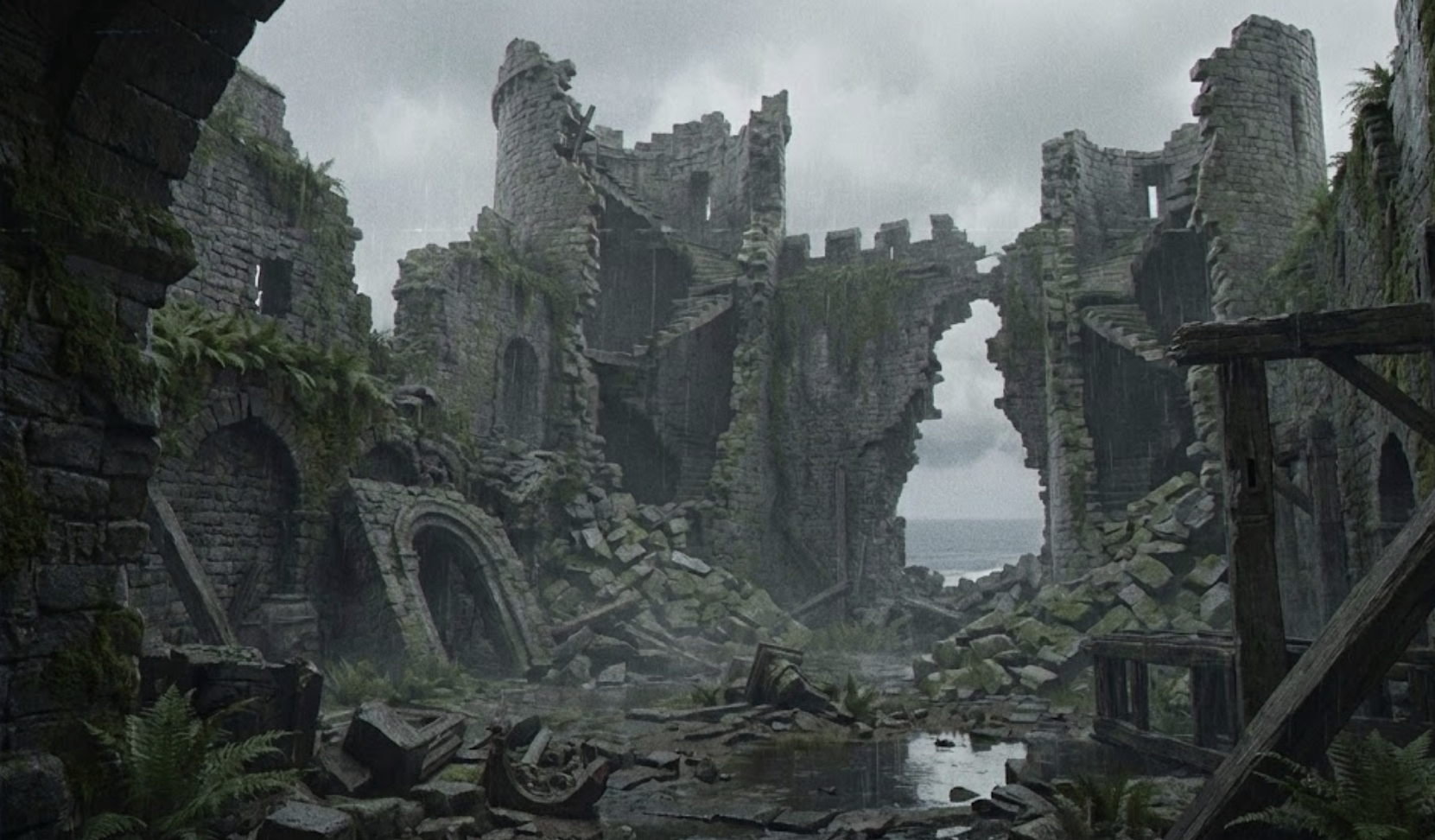 Мужчины пробираются в останки некогда огромной залы, сейчас её своды рухнули, лишь поддерживающие колонны торчат сломанными рёбрами к серому небу. В самом воздухе висит напряжение, ощущаемое физически, словно туго натянутая тетива — отпусти, и реальность лопнет осколками! Груды мокрых камней закрывают от глаз что-то в центре этой залы, и Виго замирает, чувствуя нутром, что именно там зреет новый виток разрушения, способный стереть останки крепости с лица земли.