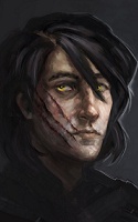 Внешность:Высокий, невероятно худой и жилистый, мужчина, с длинными и крепкими руками, выдающими в нём опытного лучника. Не молод. Всё ещё густая копна каштаново-рыжих волос начала покрываться пеплом седины, А узкое обветренное лицо с узкими губами, длинным крючковатым носом и высоким лбом давно прорезали морщины.