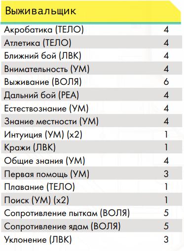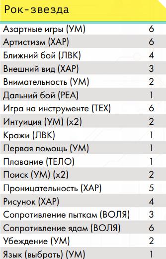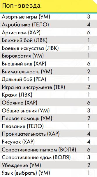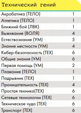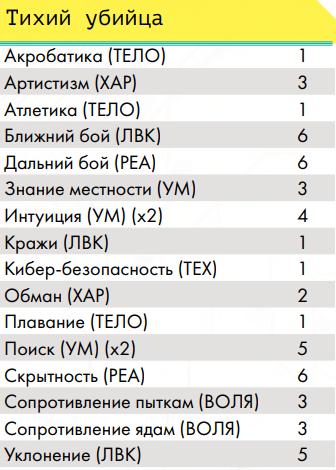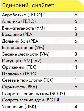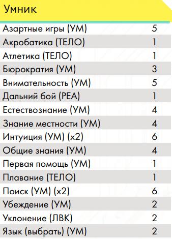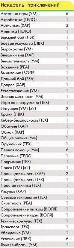 Профессиональные навыки Воины улиц• Гора – ты можешь разрывать противников руками, а также, с определённого уровня, игнорировать критические травмы типа перелом и использовать двуручное оружие ближнего боя как одноручное (по аналогии с «цепным псом» ниже, хоумрул) • Ассасин – ты умеешь прятать оружие и скрываться прямо в посереди боя • Снайпер – ты умеешь выполнять особенно опасное прицеливание из любого дальнобойного оружия. • Солдат – тебя учили метко стрелять и быть готовым к резкому началу боя или засадам. Вольные• Член семьи – представитель вольного народа на семейном транспорте • Друг семьи – ты много сделал для вольных и имеешь права на скидки на транспорт у них Журналисты• Глас народа – ты умеешь собирать слухи и выпускать статьи с разоблачениями на основе них, после сбора доказательств, а также имеешь доступ к покупке без проблем особой техники журналистов. Инженеры• Изобретатель – позволяет создавать новые вещи из той сферы, в которой ты умеешь пользоваться ими • Гаражный мастер – позволяет ремонтировать предметы, оружие, броню и транспорт • Кибертехник – ты умеешь работать с кибер-имплантами, в том числе снимать их с противников • Самоделкин – ты умеешь делать сам предметы, которые уже известны (но не изобретать новые) Корпоранты• Директор – у тебя есть подчинённые корпорации и ты можешь потом нанять новых • Цепной пёс корпорации – чем больше ты получил урона, тем больше ты наносишь урона, такова твоя чёртова работа, с определённого уровня ты умеешь использовать двуручное оружие дальнего боя как одноручное Медики• Фармацевт – по купленным рецептам ты можешь создавать препараты, но не продавать их на рынке • Инженер криосистем – ты можешь использовать криокамеры, которые позволяют успешнее проводить операции, криопакеты, позволяющие стабилизировать тело человека на месте, и криобаки для медицинского хранения внутренних органов • Специалист по клонированию – ты можешь использовать, покупать и арендовать оборудование для клонирования Сёрферы• Белый хакер – у тебя есть доступ ко всем программам и скидка на их покупку • Чёрный хакер – каждый уровень даёт тебе скидку на нелетальные программы и снаряжение для твоей деки, но тебе нужно искать того, кто ими торгует, а твоя популярность в народе растёт по мере роста уровня • Программист – ты умеешь писать свои собственные программы, постепенно повышая их сложность • Дайвер (хоумрул) – ты умеешь погружаться в Океан и возвращаться из него с помощью силы своего подсознания. Профессия не прокачивается выше 4 уровня; на 1 ты можешь в любой момент выходить из полного погружения (хоумрул: остальным нужно в Океане прийти к месту входа), если не попал в ловушку Острова, который ломаешь; на 2 ты можешь нырнуть под поверхность Океана (получив урон осознанности) на число раундов, равное твоей профессии (хоумрул: остальные так не могут и перемещаются по правилам, которые навязывает им Остров и их подсознание), чтобы в том числе выплыть из ловушки или просто исчезнуть с радаров вражеского сёрфера (хоумрул: правда, он может попытаться догнать тебя, если он тоже дайвер), кроме того ты не «тонешь» оказавшись без активной программы «понтон»; на 3 уровне ты можешь помогать не «тонуть» другому и даже принудительно выныривать вместе с тем, кого что-то тянет глубже в Океан;