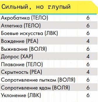 Навыки: • Рукопашный бой (основное) = 20 • Атлетика = 10