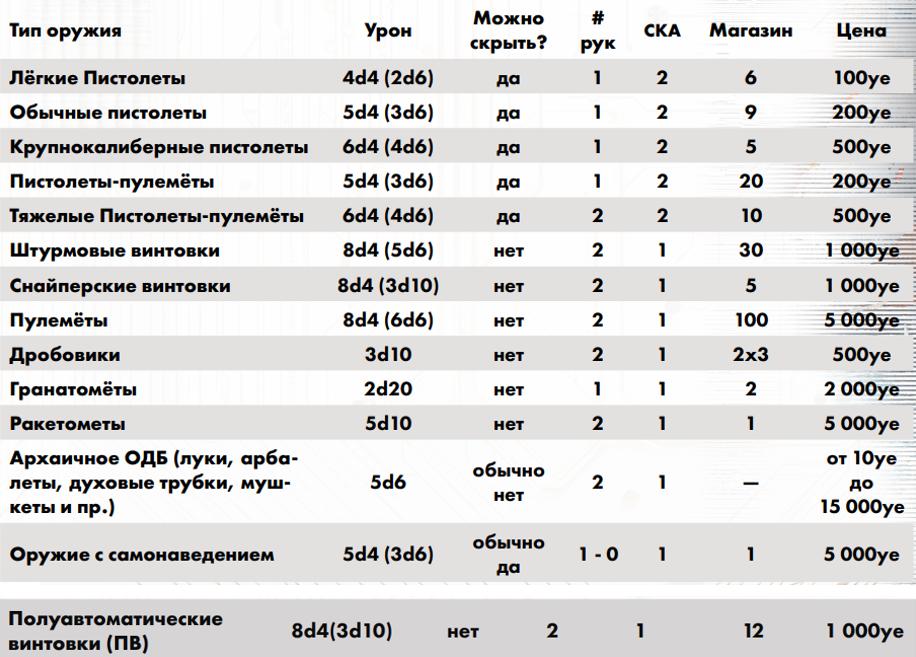 Оружие дальнего боя: лёгкий пистолет (ЛП) – 100 обычный пистолет (ОП) – 200 крупнокалиберный пистолет (КП) – 500 пистолет-пулемёт (ПП) – 200 тяжёлый пистолет-пулемёт (ТПП) – 500 дробовик (ДР) – 500 у.е.