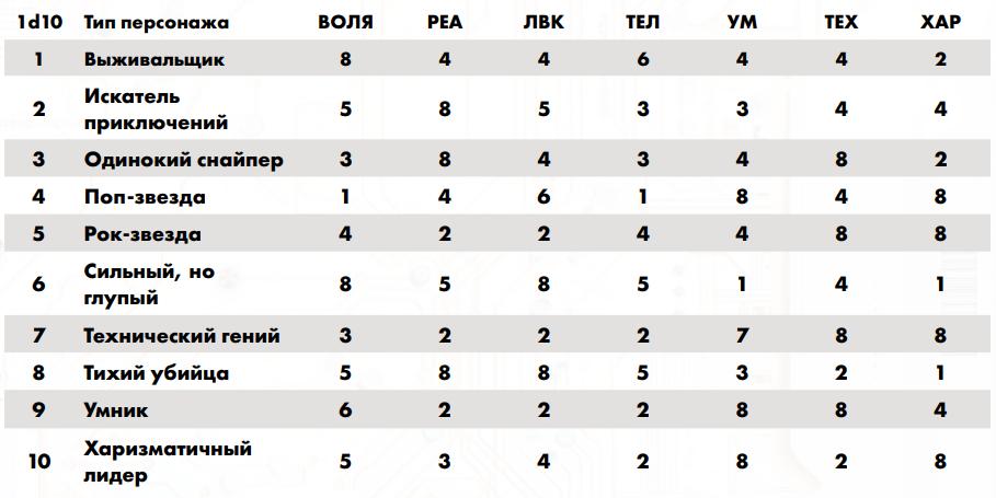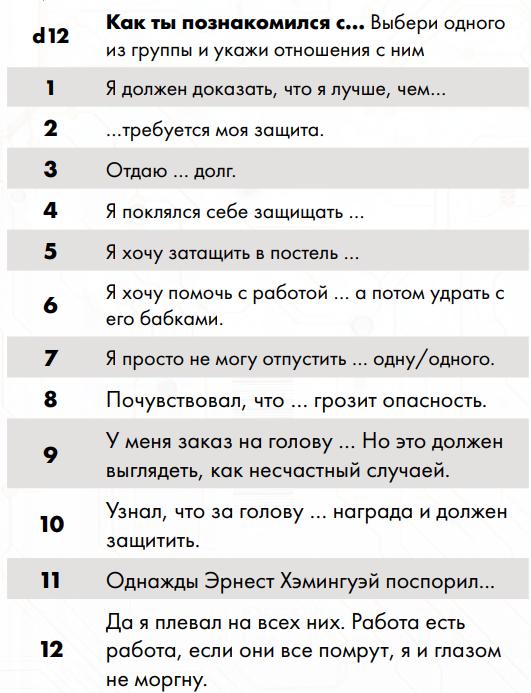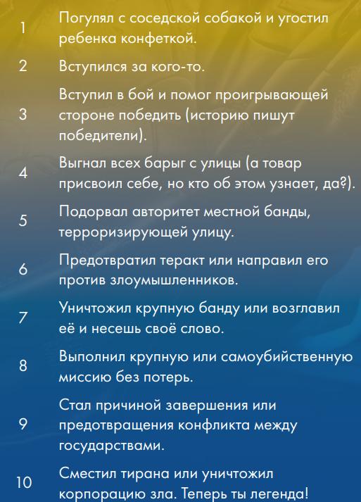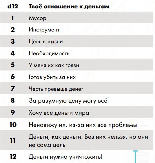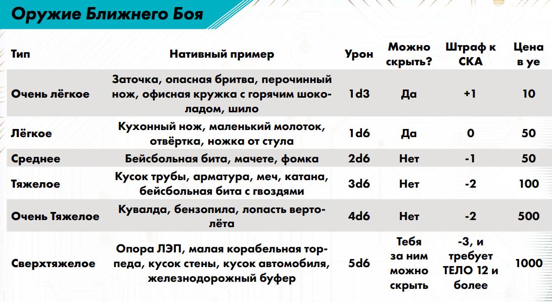 Медицинская страховка: рабочая – 500 / месяц корпоративная – 1000 VIP - 5000 Указатель инструментов мастера Основная книга 1) Движок системы - см. стр. 36 Основной книги 2) Боевая система - см. стр. 88 Основной книги 3) Транспорт - см. стр. 126 Основной книги 4) Стелс-миссии - см. стр. 140 Основной книги 5) Снаряжение, инвентарь, импланты - см. стр. 146 Основной книги 6) Недвижимость - см. стр. 178 Основной книги 7) Госпитали и препараты - см. стр. 188 Основной книги 8) Работа сёрфера в режиме "здесь и сейчас" - см. стр. 208 Основной книги 9) Создание персонажа и его случайной биографии - см. стр. 230 Основной книги 10) Создание случайного города - см. стр. 246 Основной книги 11) Случайная достопримечательность - см. стр. 260 Основной книги 12) Случайная погода - см. стр. 269 Основной книги 13) Что лежит в мусорке - см. стр. 272 Основной книги 14) Зайди в случайную лавку на углу - см. стр. 273 Основной книги 15) Генератор банд - см. стр. 278 Основной книги 16) Генератор работы - см. стр. 283 Основной книги 17) Случайное столкновение на улицах - см. стр. 286 Основной книги 18) Система болванчиков в роли врагов - см. стр. 288 Основной книги 19) Примеры сценариев - см. стр. 298 Основной книги DLC 1 1) Океан и полное погружение в него - см. стр. 3 DLC № 1 2) D20 дронов и турелей - см. стр. 10 DLC № 1 3) D20 бытовых умных устройств - см. стр. 15 DLC № 1 4) Создание Острова - см. стр. 16 DLC № 1 или онлайн генератор ссылка5) Генератор корпораций - см. стр. 26 DLC № 1 6) Вторжение чужого случайного (d88) разума из Сети - см. стр. 36 DLC № 1 DLC 2 1) Уличное самодельное оружие - см. стр. 7 DLC № 2 2) Старое военное оружие - - см. стр. 23 DLC № 2 3) Надёжное корпоративное оружие по мотивам старого - см. стр. 7 DLC № 30 4) Эксклюзивное и навороченное корпоративное оружие - см. стр. 7 DLC № 39 5) Оружие корпоративного ассасина - см. стр. 7 DLC № 58 6) Космическое оружие - см. стр. 66 DLC № 2 7) Бар наёмников - см. стр. 72 DLC № 2 8) Офис корпорации - см. стр. 76 DLC № 2 9) Лагерь вольного народа - см. стр. 86 DLC № 2 DLC 3 1) Занятия при простое персонажа - см. стр. 3 DLC № 3 2) Социальные связи для персонажей - см. стр. 11 DLC № 3 3) Медитации и кибермедитации - см. стр. 24 DLC № 3 4) Экстремальный заработок - см. стр. 27 DLC № 3 5) Погони на транспорте - см. стр. 63 DLC № 3 6) Новые модули для наземного транспорта - см. стр. 67 DLC № 3 7) Механика топлива для тачек - см. стр. 68 DLC № 3 8) Новая система получения очков обучения - см. стр. 71 DLC № 3