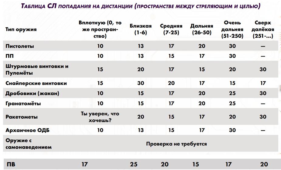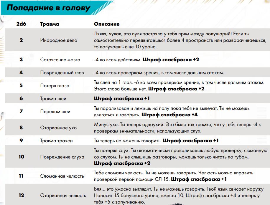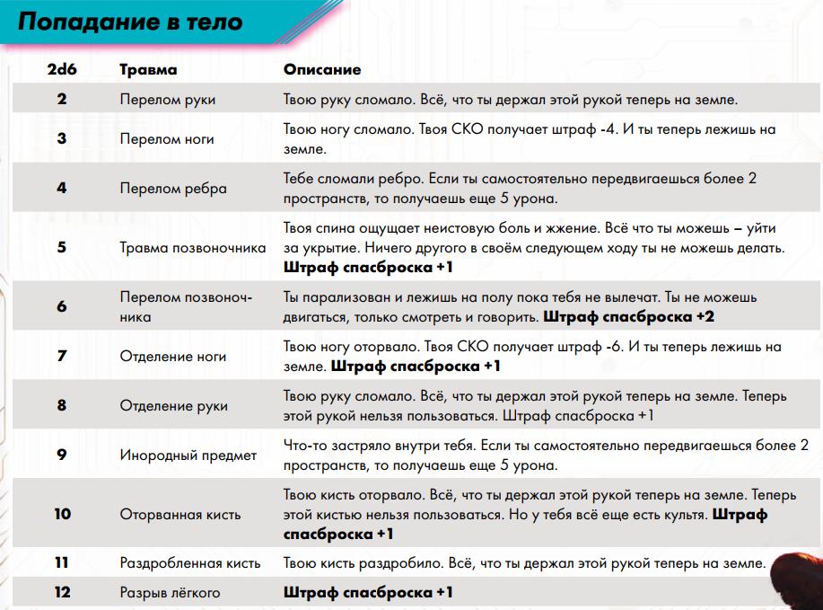 • резиновые – при снижении Пунктов Здоровья до 0 цель теряет сознание на 1d6 ходов. 8) Учёт шаблона поражения (дробовиков, ракет, гранат) Шаблонные области атаки: - взрыв – 5x5 зон вокруг эпицентра; - дробовик – 3х3 зоны ровно перед стрелком; - луч – линия; - широкий луч – 1 клетка перед стрелком и зона 3xL далее (L – дальность луча); - огнемет – первый ряд ровно перед стрелком 3 зоны, второй ряд – 4 зоны, третий ряд – 4 зоны и половина урона; 9) Проверка атаки (число атак = СКА) против сложности попадания на дистанции до цели (см. экстремальный успех/провал и критические травмы) 1) Атака Оружием Дальнего Боя (ОДБ) = ( 2d6 + навык Дальний бой + характеристика Реакция ) против Сложности (СЛ) попадания по таблице (требуется выбросить число больше Сложности попадания). Экстремальный успех проверки атаки (6 на обоих 2d6) всегда наносит критическую травму, но без бонусного урона этой травмы.  Дробь стреляет по области 3x3 зоны перед стрелком, имеет Сложность попадания 15, наносит урон 4d6 урона (но не ломает броню). • Урон ОДБ = [броску костей урона оружия, которые зависят от его типа] – [Останавливающая Способность (ОС) брони цели или Врождённая Останавливающая способность (ВОС) без брони]. Урон от взрывов и дроби считается от минимального показателя брони на всех частях тела, не получает множителей (например, от попадания в голову), а взрыв ломает броню на всех частях тела (дробь не ломает броню вообще). Если ОС брони не полностью погасила урон, то значит атака преодолела броню (срабатывают её различные эффекты) и ломает её, уменьшая число ОС на 1.  • Критическое попадание (урон с экстремальным успехом на костях урона) и критическая травма: если на двух и более костях урона выпадает 6+, то это критическое попадание, которое всегда наносит критическую травму (брось 2d6 по таблице для тела), не важно смогла атака преодолеть ОС брони цели. Если такая атака преодолела ОС брони цели, то цель получает ещё +5 бонусного урона напрямую в Пункты Здоровья (ПЗ). По умолчанию травма наносится попаданием в тело, а при прицельном выстреле в голову – в голову. • Таблица критических травм для головы используется только если попадание было совершено при помощи прицельного выстрела в голову. Сам факт попадания в голову наносит 1 критическую травму при условии, что хотя бы 1 урона прошла через ОС брони (такая травма наносится без бонусного урона). Если же при попадании в голову на двух и более костях урона выпадает 6+, то травма наносится в любом случае (даже если урон не преодолел ОС брони), плюс цель получает 10 бонусного урона напрямую в ПЗ.   2) Атака оружием ближнего боя (ОББ) = ( 2d6 + навык Ближний бой + характеристика Ловкость ) против ( 2d6 + навык Уклонение + характеристика Ловкость) противника (при равенстве всегда побеждает защищающийся) • Скорость Рукопашного Боя (СРБ) для ОББ = ( [Ловкость / 3]* + штраф от оружия ), но не менее 1 * - округлять в большую сторону • Любой персонаж с общим навыком Ближний бой может совершать действия ближнего боя: захват, удушение, бросок.  3) Метательная атака = 2d6 + навык Атлетика + характеристика Телосложение по таблице Сложности (СЛ) как для попадания гранатомёта (но не дальше, чем на 12 зон), при этом гранаты наносят свой взрывной урон, а оружие ближнего боя (ОББ) – свой нормальный урон (но не игнорирует половину ОС брони цели, как в ближнем бою). Если ОББ одноручное, то его можно прице