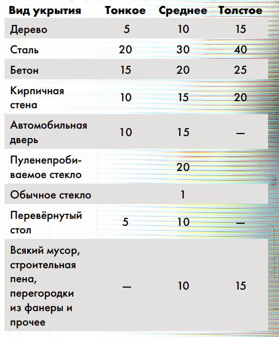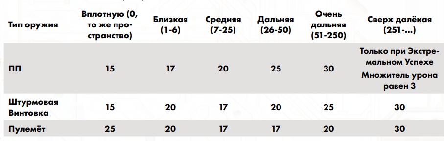 • выйти из состояния «сбит с ног» (перевернуться на живот и ползти, сесть за укрытие или встать), потратив 1 действие. 4) Выбор типа стрельбы (одиночный выстрел, автоматический огонь и проч.) • одиночный выстрел – обычная атака (в этом и всех режимах стрельбы ниже по умолчанию попадание происходит туловище, если только на это не влияет нарратив, например, противник стоит так, что попадание будет в другую часть тела); • прицельный выстрел – выбери зону попадания (Сложность для головы +8, для остальных частей + 6) и потрать всё действие на 1 выстрел (Скорость Атаки считается как 1 в любом случае), в зависимости от места попадания, если атака преодолела Останавливающую Способность (ОС) брони цели, она получает специальные эффекты: - голова – удваивает урон после ОС шлема, наносит 1 критическую травму без бонусного урона и доп. +10 урона при критической атаке; - оружие – снижает очки качества на 20; - рука – уронить все предметы в руке; - нога – травма «перелом ноги». • автоматический огонь – потрать 10 патронов и сделай проверку [ 2d6 + Дальний бой + Телосложение ] против Сложности по таблице авто-огня (Сложность для авто-дробовика всегда равна 20), после умножь урон автоматического огня: - ПП = 1d6; - Штурмовая винтовка = 2d6; - Пулемёт = 4d6; - Автоматический дробовик = 3d6 (с множителем не более 3); на количество единиц, на которое ты превзошёл Сложность по таблице, но этот множитель не может быть выше 5:  • автоматический огонь на подавление – проверка 2d6 + навык Дальний бой + характеристика Реакция против проверки жертв 2d6 + навык Стойкость + характеристика Воля, все непрошедшие проверку должны в свой ход потратить движение и действие, чтобы бежать в ближайшее укрытие и спрятаться, а кто хочет и может остаться - получают урон 2d6 (хоумрул – урон как для обычного автоматического огня, но без множителя); • автоматическая стрельба вслепую из укрытия – выбери линию из 10 зон и потрать 10 патрон (назначать цели атаки или делать прицельный выстрел нельзя), затем пройди проверку навыка Дальний бой со Сложностью 18: каждая цель, которая до твоего следующего хода пересекает эту линию, получает урон 2d4, умноженное на количество единиц, на которые ты превзошёл Сложность, а цели, которые уже были на линии в момент твоей атаки, должны отойти на 1 зону или сесть/лечь в укрытие, все укрытия на линии получают урон по своим Пунктам Здоровья; Хоумрул: стрельба вслепую дробью: все, кто пересекает центральную линию шаблона атаки дробью до твоего следующего хода, получают урон как при стрельбе дробью, а те, кто остановился на крайних зонах шаблона, должны сдвинуться на 1 зону, чтобы выйти за него, или сесть в укрытие. • стрельба по-македонски – выстрели с двух рук на расстояние не более 10 зон (все бонусы прицелов, кроме лазерных, игнорируются, проверка попадание имеет Сложность +6 за каждый следующим парный выстрел, отрицательные модификаторы распространяются на оба оружия, даже если есть только у одного, а положительные должны иметь источник на обоих оружия, иначе – игнорируются), при этом один бросок применяется на оба оружия (если у одного из оружий СКА больше, то оно может стрелять в конце одиночно). 5) Учёт модификаций, установленных в слотах оружия Модификации оружия дальнего боя: барабанный магазин – 500 увеличенный магазин – 100 мелкокалиберный глушитель – 250 мембранный глушитель - 250 крупнока