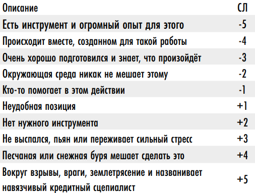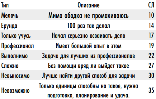 Таблица модификаторов сложности проверок: 2) Расширенные проверки (драматические) • Это простая проверка, в которой вычисляется уровень успеха, чтобы сравнить его с таблицей исходов расширенных проверок (см. ниже) • Уровень успеха = десятки от (характеристики + навыка + модификаторов) – десятки от результата проверки • Навык/характеристика превышает 100 => +1 к уровню успеха за каждые 10 пунктов превышения Таблица исходов расширенных проверок: 3) Встречные проверки • Встречные проверки это две расширенные проверки двух противостоящих персонажей, в результате чего побеждает тот, у кого выше уровень успеха (при равных уровнях успеха - самый высокий показатель навыка у участников) • Уровень успеха = десятки от (характеристики + навыка + модификаторов) – десятки от результата проверки • Разница уровней успеха = итоговый уровень успеха победителя • Разница уровней успеха = 0 означает ничью, победитель определяется тем, у кого самый высокий проверенный навык/характеристика без учета модификаторов преимущества, состояний, ситуационных модификаторов (FAQ разработчиков) • Результатом встречной проверки обязательно является победа одного из участников, даже если оба соперника провалили свою проверку: в данном случае роль играет только разница между уровнями успеха (победа есть победа, даже если она достигнута самым грубым и неуклюжим из возможных способов) • Некоторые встречные проверки не учитывают отрицательный уровень успеха при определении итогового уровня успеха победителя, например, проверка навыков "уклонение" или "рукопашный бой" с целью защиты от дистанционного оружия не учитывает ни отрицательный уровень успеха обычной проверки стрелка (в таком случае он просто промахивается), ни отрицательный уровень успеха обычной проверки защищающегося (его поражение в проверке против его же навыка уклонения или рукопашного боя не увеличивает урон по нему); это правило применяется тогда, когда провал защиты не должен приводит к увеличению успеха атакующего (в том числе при развеивании вражеских заклинаний) • Если персонаж проходит встречную проверку силы (или одного из привязанных к ней навыков) против существа, размер которого хотя бы на 2 ступени превышает его собственный, это существо сразу становится победителем — без всяких проверок; если существо всего на 1 ступень размера больше, встречная проверка состоится, только если проверка меньшего по размеру персонажа окажется удачной — в этом случае победитель встречной проверки определяется как обычно (иначе большее существо становится победителем без дальнейшего сравнения уровней успеха) 4) Продолжительные проверки • Это расширенная проверка, которая проводится в каждом раунде состязания с накоплением успехов • Уровень успеха = десятки от (характеристики + навыка) – десятки результата проверки • Уровни успеха раундов складываются и накапливаются • Число раундов может быть ограничено • Дополнительное правило: успешная проверка всегда даёт хотя бы +1 к суммарному уровню успеха, а проваленная проверка никогда не вычитает успехи (по FAQ разработчиков).