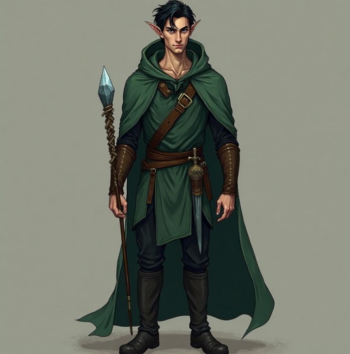 Крайне молод(особенно по меркам эльфов), голубоглаз, черноволос, красив, бывает красноречив, но кажется самоуверенным. После пострига предпочитает одеваться в практичную темно-зеленую одежду.