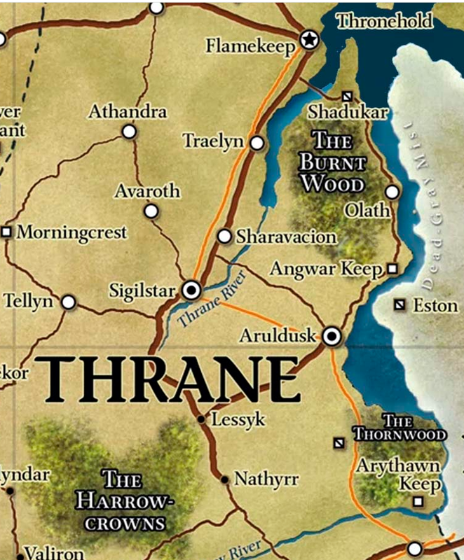 Сначала виден не город, а стена: тёплый серый камень, башни с зубцами, флаги Серебряного Пламени, лениво колышащиеся на ветру. Стена уходила вправо, к поблёскивающей глади озера Арул; слева её пересекала линия молниевой дороги, уходящая к Сигилстару.