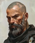 Его лицо — словно высечено из того же камня, что и стены часовни: резкие скулы, глубоко посаженные глаза, шрам над левой бровью — тонкий, бледный, будто проведённый лезвием. Форма — тёмно‑серая, без лишних знаков различия, кроме эмблемы на плече: чёрный ворон на фоне треснувшего аквилы . Металл значка отсвечивает матово, без бликов — будто поглощает свет, а не отражает его.