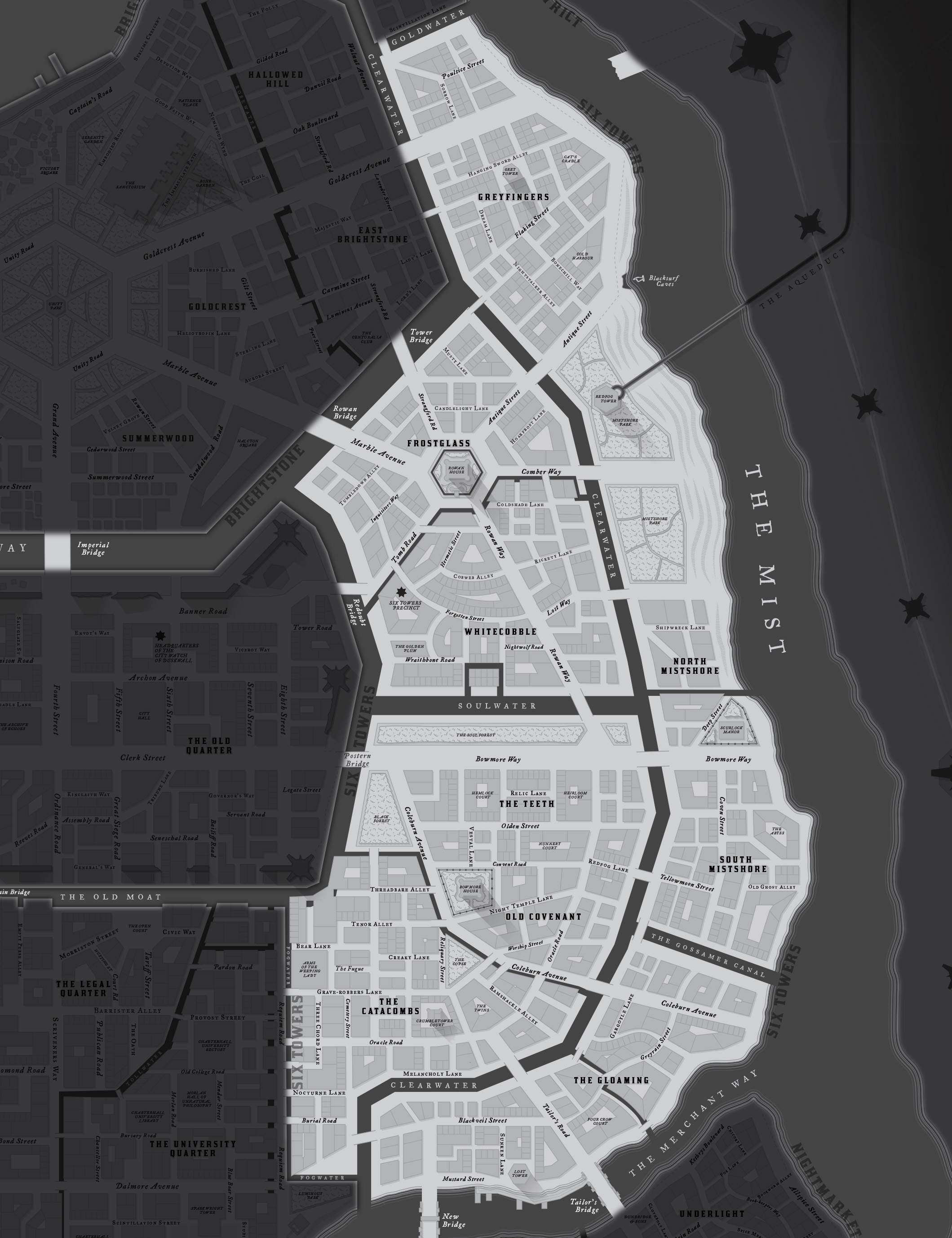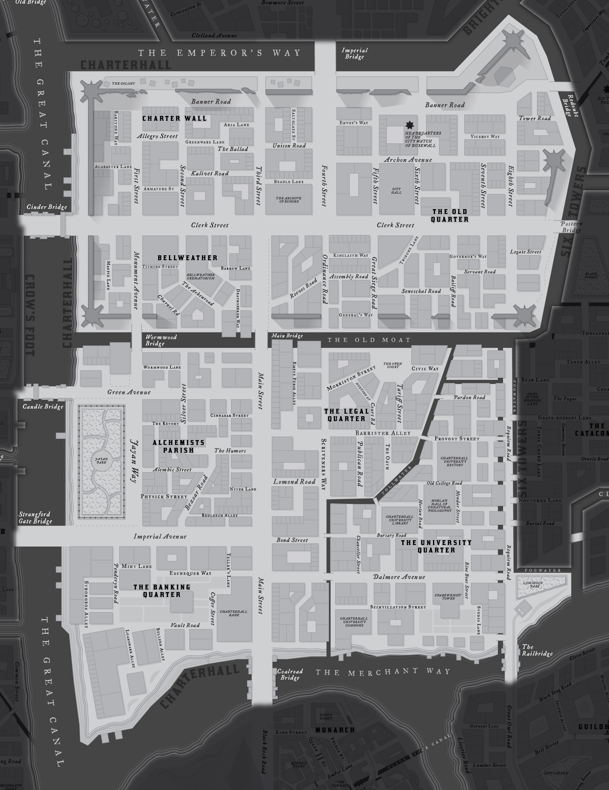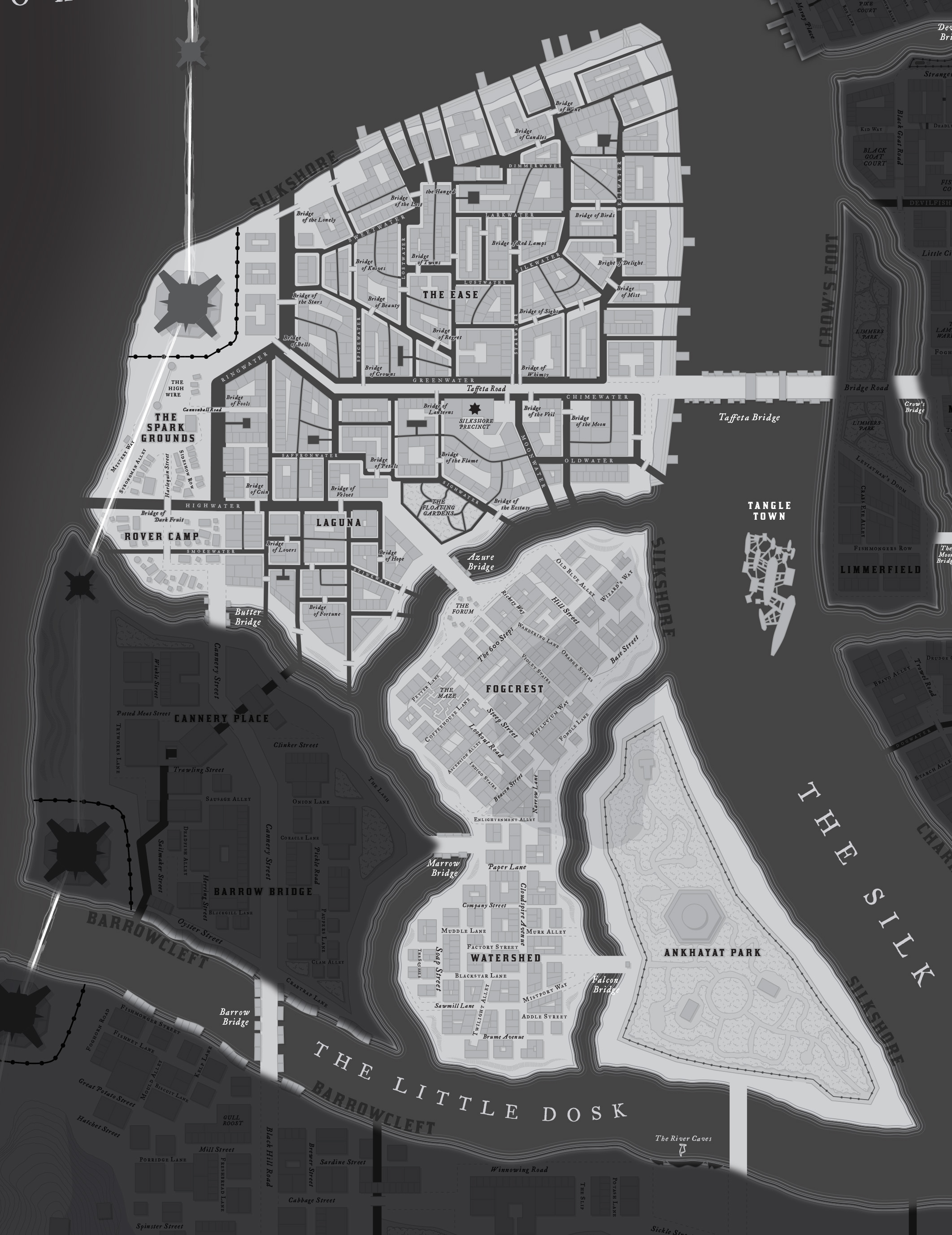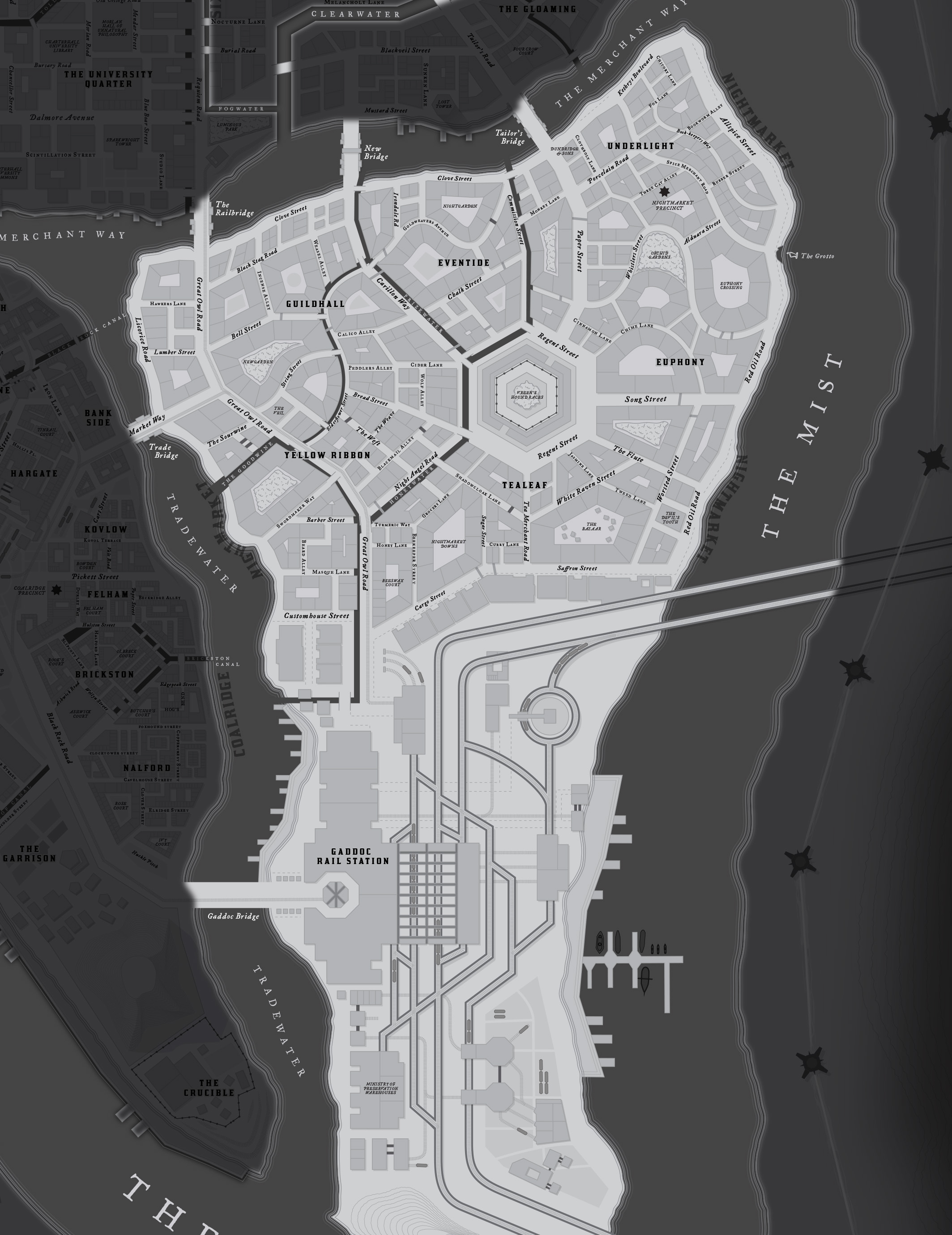 Формально все они служат городу и горожанам, но в Даскволе горожане не равны. Мелкие имперские аристократы, фабриканты, чиновники и толстосумы-нувориши населяют улицы Брайтстоуна и Короны, где широкие мостовые ярко освещены электроплазменными фонарями. Из местных ресторанов круглые сутки доносятся звуки живой музыки; там подают сладкие ирувийские вина, жирных угрей и хлеб из зерна, выращенного под светом плазменных ламп. Богатеи катят перед подсвеченными витринами на кэбах, запряжённых тягловыми козлами. В витринах на манекенах красуются вечерние платья и фраки из заморских тканей.