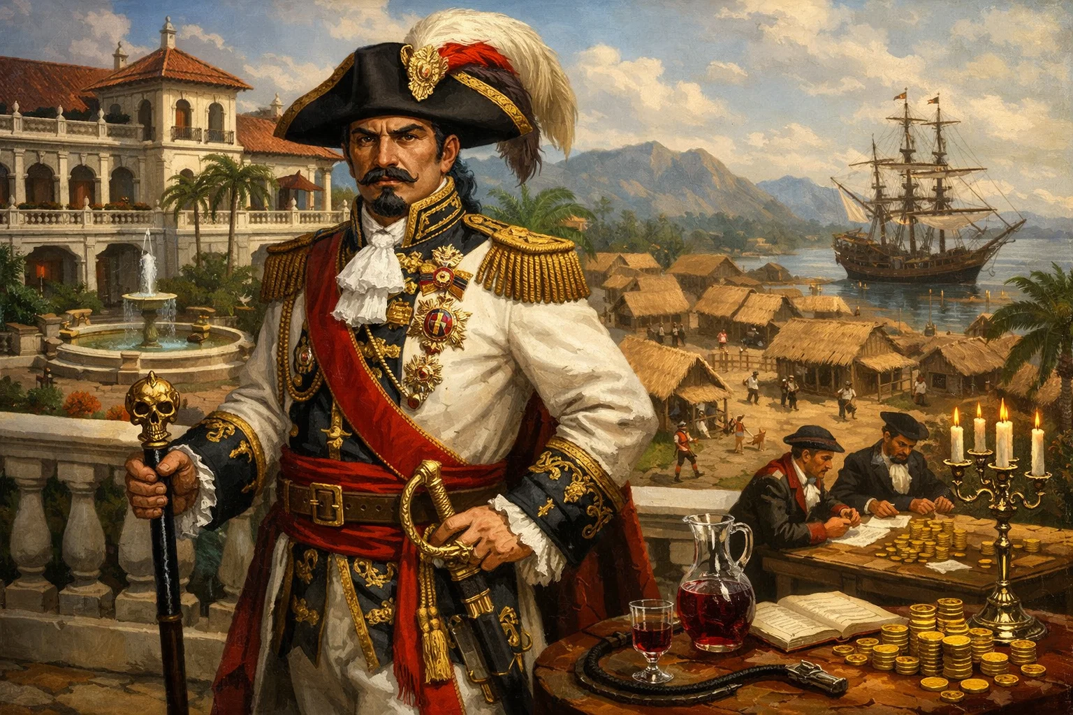Губернатор искренне считает себя оплотом королевской власти на острове. Любую критику — даже брошенную шёпотом и без умысла — он воспринимает как личное оскорбление и почти как покушение на Корону. Ответ всегда один: быстрый, показательный и окончательный. Казни здесь редки лишь потому, что все давно усвоили правила.
