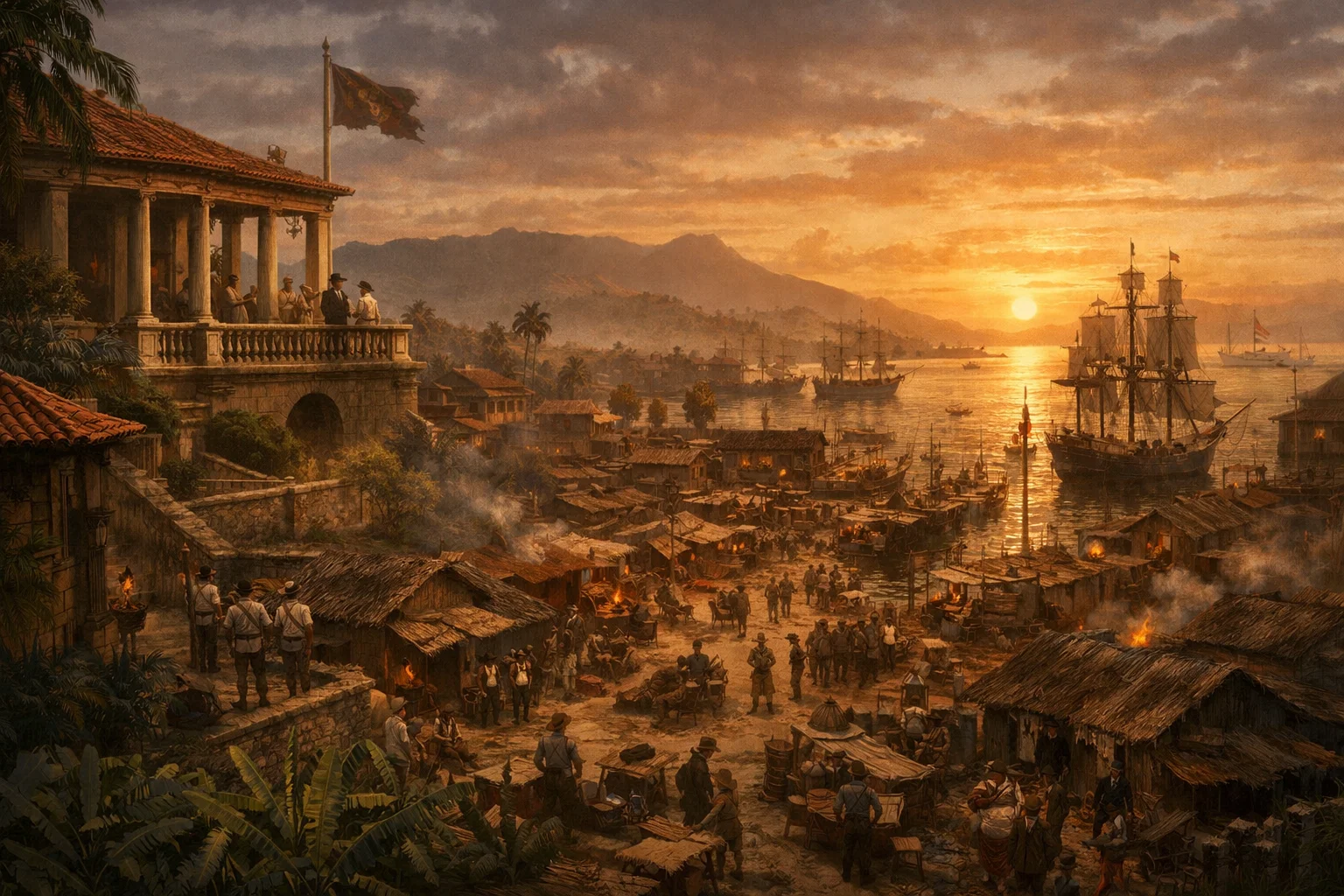Колония на этом острове с первого взгляда кажется редким образцом заморского благополучия. У берега стоит деревянный причал, принимающий грузовые суда; в амбарах — избыток дешёвой кукурузы с единственной крупной плантации, на аккуратных прилавках небольшого прибрежного рынка — рыба, выловленная местными, а чуть дальше от берега работает небольшое, но стабильное месторождение золота. Именно оно стало главным магнитом, притянувшим сюда переселенцев, авантюристов и людей с надеждой на быстрый подъём. Золото — основной экспорт колонии и причина того, что метрополия не спускает с острова глаз.