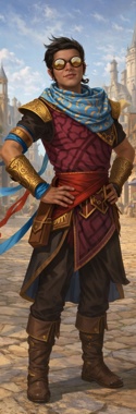 Носит тёмный кожаный доспех с чёрной одеждой, с вкраплением синих элементов, и синий длинный шарф.