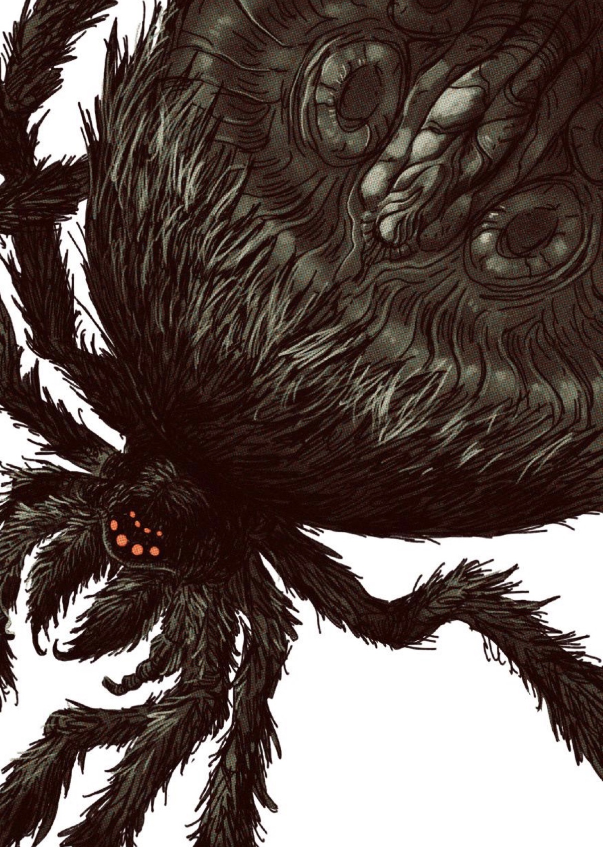 Озма обратил всё свое внимание на дверь.. или что это вообще такое было? Хитин, покрытый странными узорами, и явно закрывающий проход с той стороны. При этом никаких щелей в камне, ни рычагов или ручек коракс не заметил, а потому ничтоже сумняшеся вытащил свой боевой серп и попробовал провести лезвием по линии соприкосновения двери и скалы. Когда преграда сдвинулась, Озма даже успел обрадоваться что разгадал загадку, но в следующее мгновение отпрянул с испуганным карканьем: псевдодверь оказалась часть тела огромного паука, что ловко развернулся в проходе и двинулся к незваным гостям!