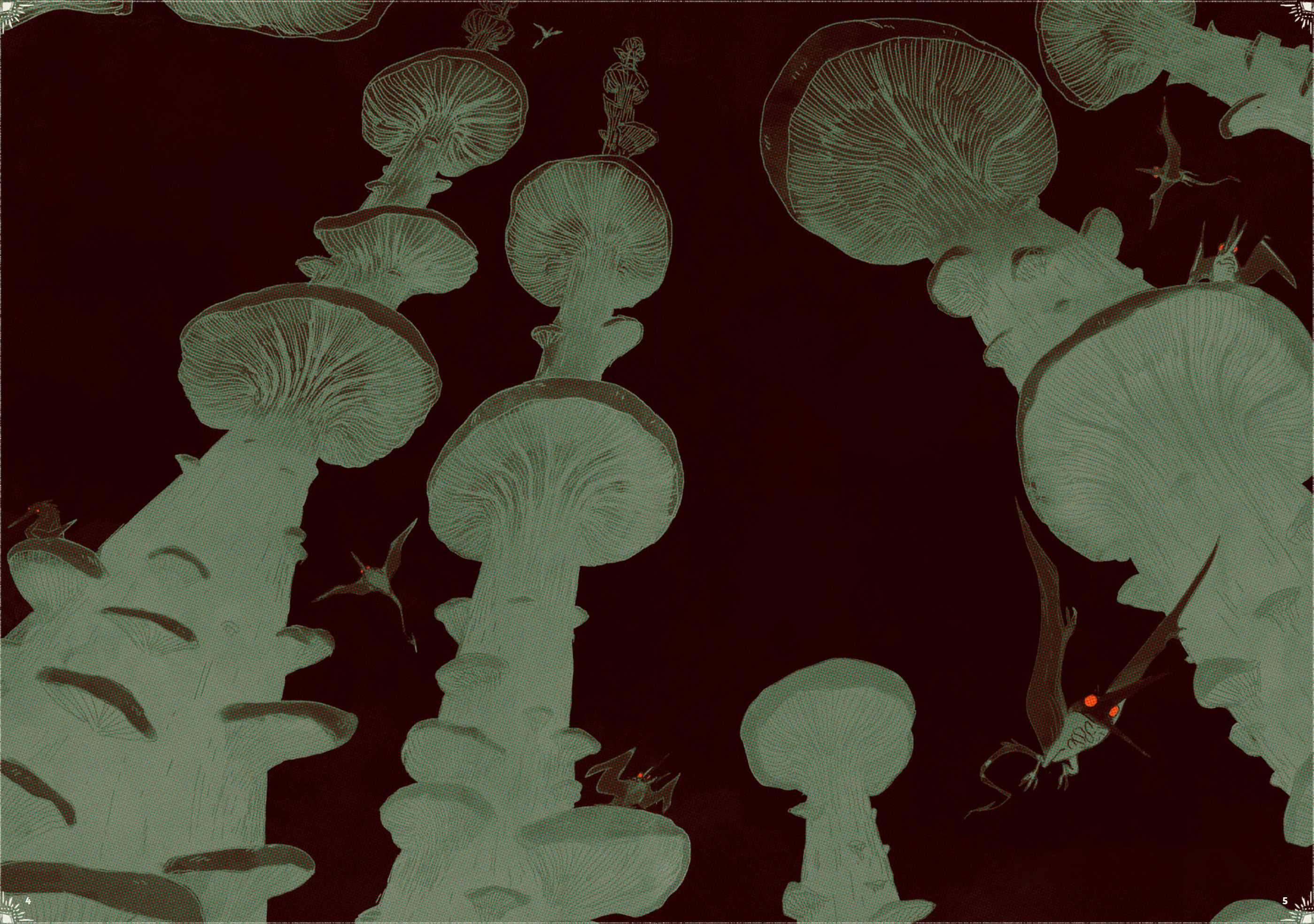 Над опушкой раздались хлопки кожанных крыльев и через мгновение на грибные шляпки с характерным шлепком приземлися огромный красноглазый нетопырь с двумя клинками за спиной.